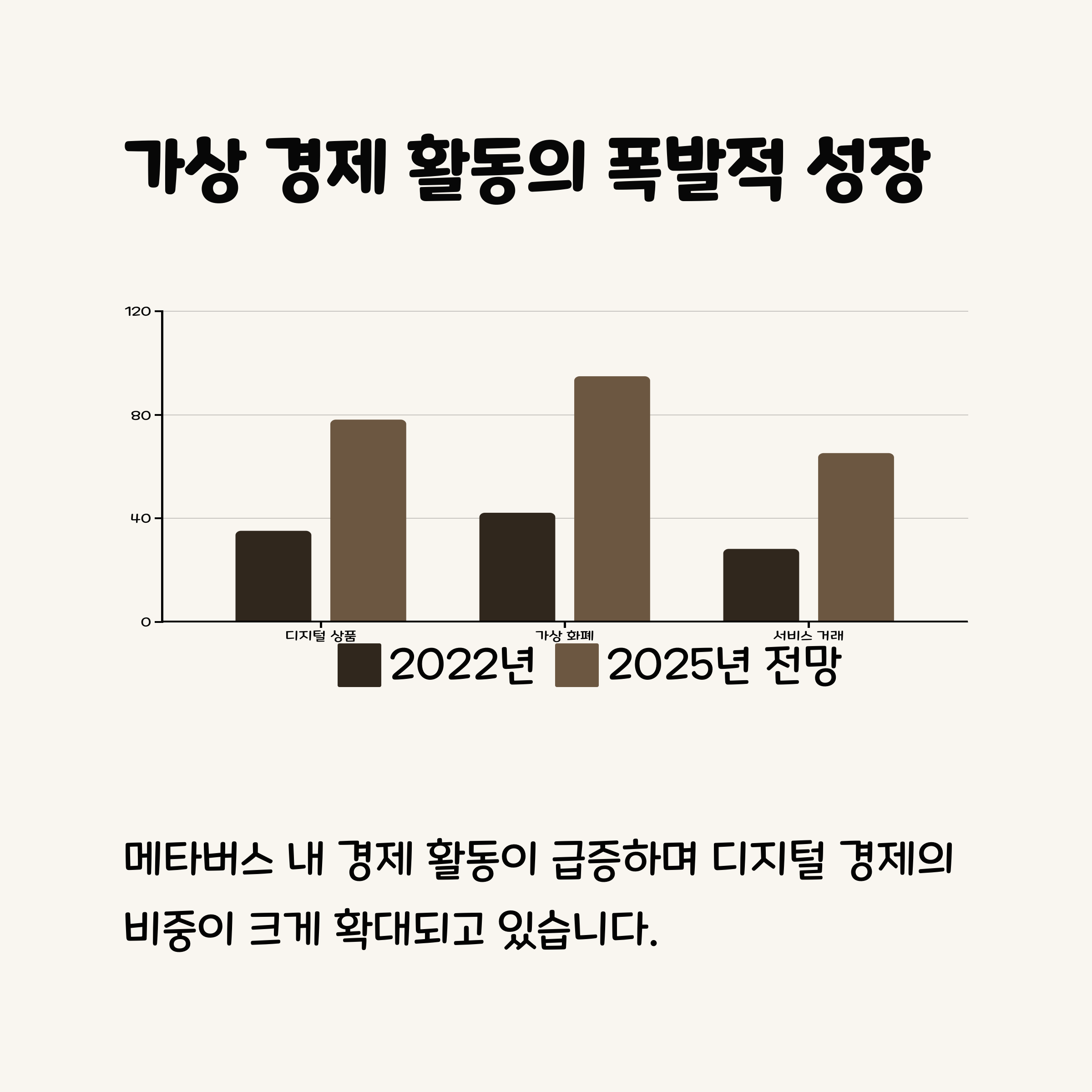 1. 디지털 경제의 확장 메타버스는 가상 자산과 블록체인 기술을 기반으로 새로운 경제 생태계를 구축하고 있습니다. 특히 **NFT(대체 불가능한 토큰), 가상 부동산, 디지털 화폐**가 활성화되며 기업과 개인 모두 **디지털 공간에서 재화를 생산하고 소비**하는 시대가 열리고 있습니다. 예를 들어, 일부 기업들은 메타버스 내에서 **가상 매장을 운영**하고, 소비자들은 NFT를 통해 **디지털 자산을 거래**하며 새로운 경제 모델을 경험하고 있습니다.
