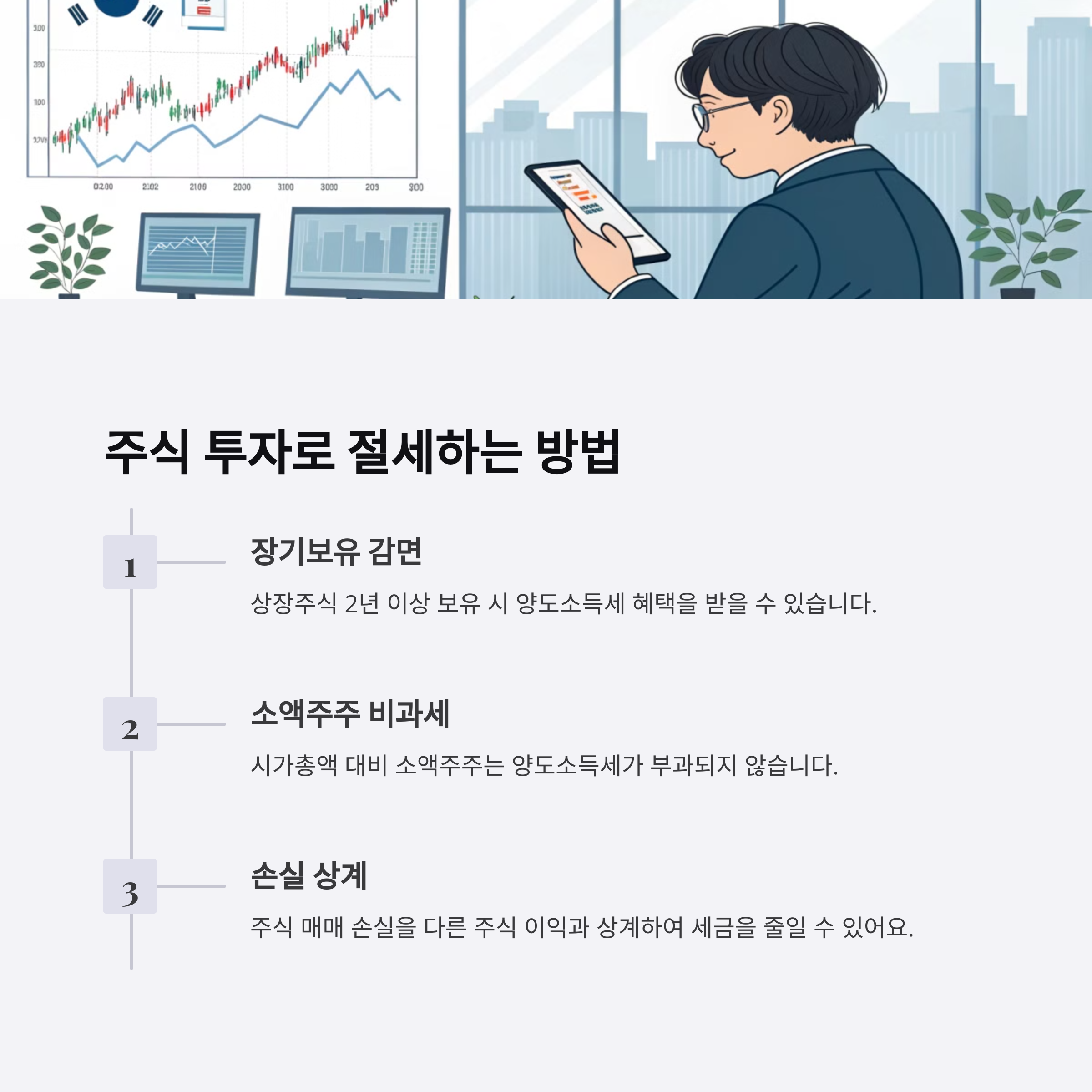 2. 부동산과 주식 투자 시 절세 전략 부동산을 매매할 때 **양도소득세 부담**을 줄이려면 **장기보유특별공제**를 활용하는 것이 중요합니다. 2년 이상 보유 시 기본 세율이 적용되며, 10년 이상 보유하면 최대 40%까지 공제받을 수 있습니다. 또한 주식 투자 시 **연간 5천만 원 이하의 금융투자소득**은 비과세되며, 세금을 줄이기 위해 **배당소득이 낮은 상품을 선택**하는 것도 좋은 전략입니다.