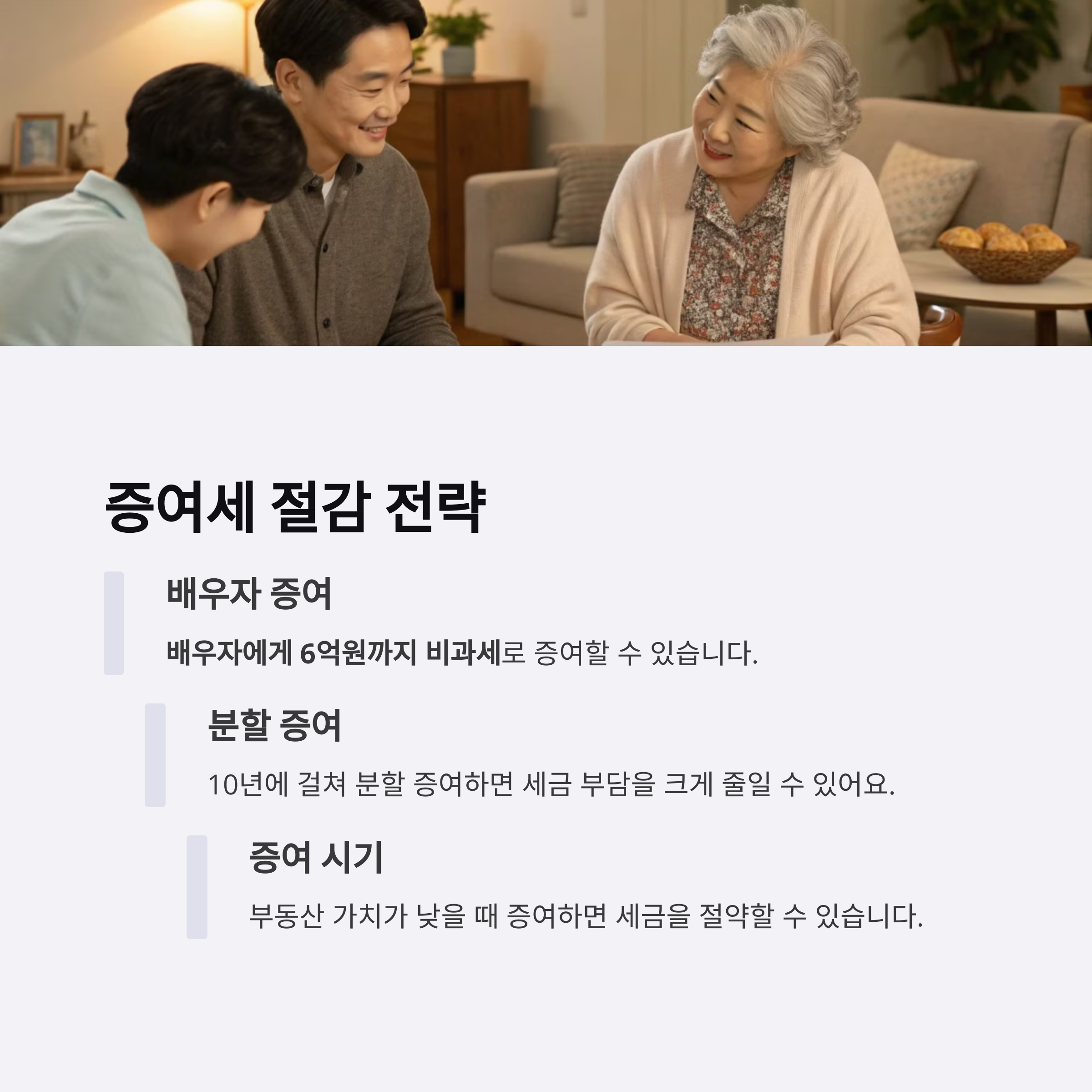 부모가 자녀에게 재산을 물려줄 때 **증여세 부담**이 크기 때문에 미리 계획적으로 증여하는 것이 중요합니다. 10년 동안 **성인 자녀는 5천만 원, 미성년 자녀는 2천만 원까지** 증여세 없이 증여할 수 있으며, 배우자에게는 6억 원까지 비과세됩니다. 이를 활용해 **수년에 걸쳐 나누어 증여**하면 세금 부담을 줄일 수 있습니다.