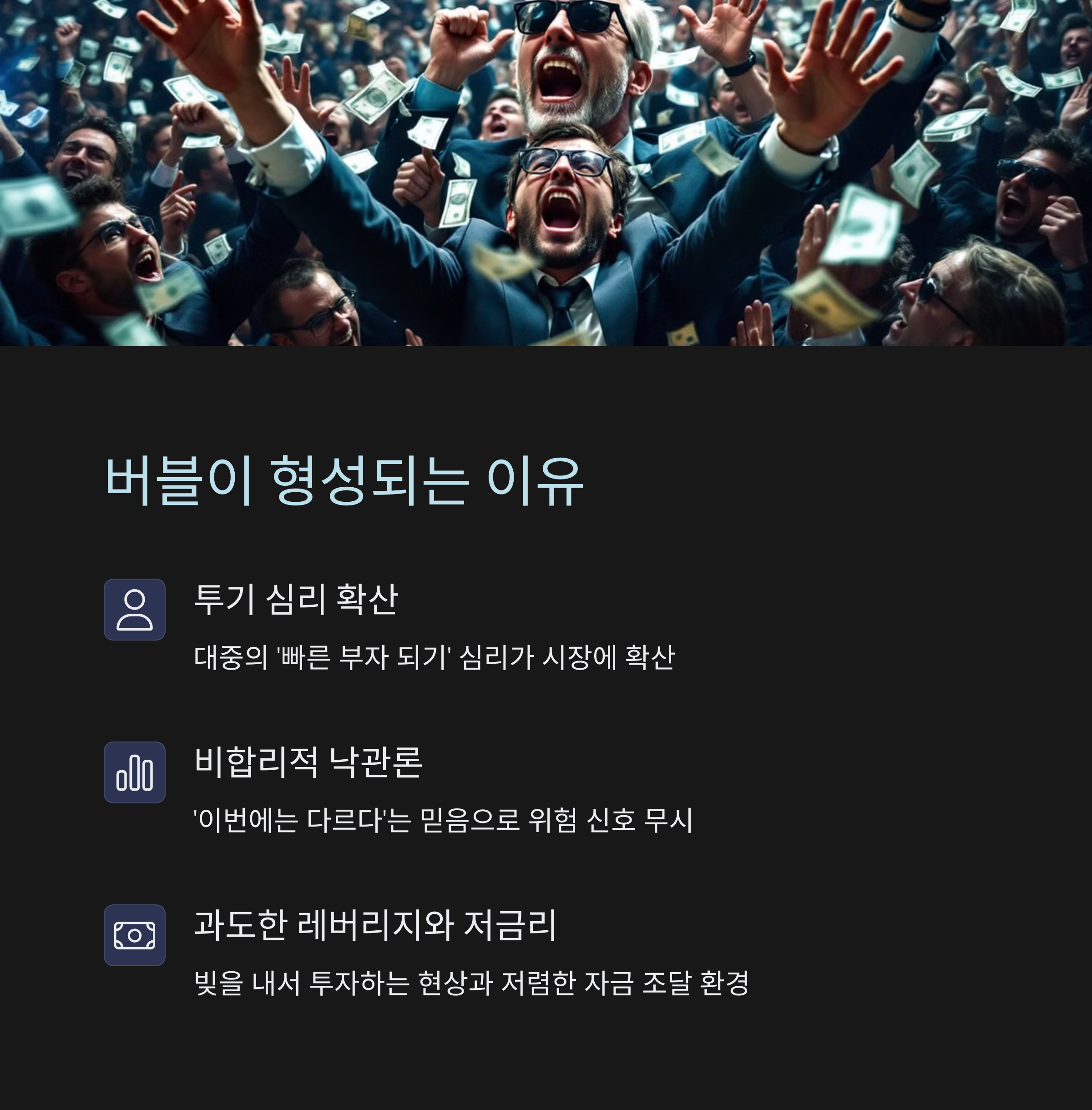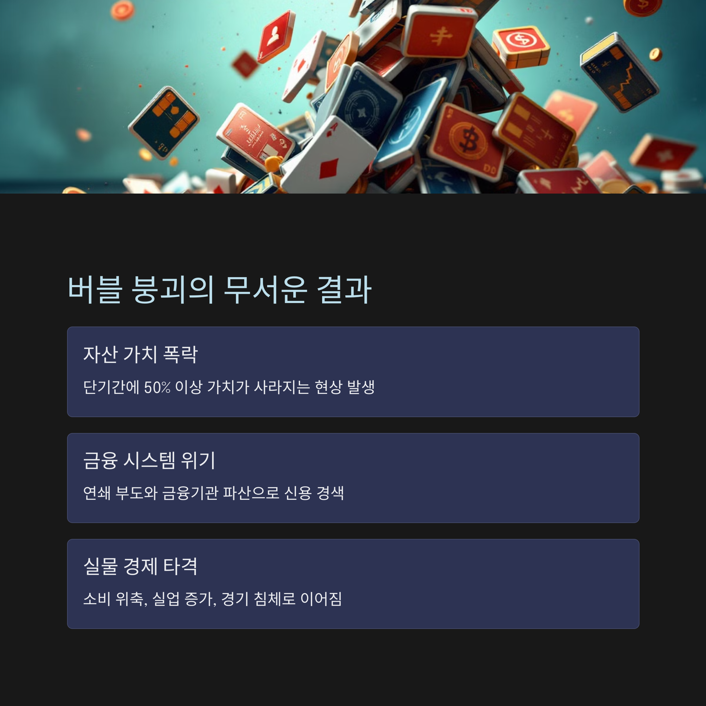 | 왜 중요한가? | 버블 붕괴는 금융 위기, 실업 증가, 소비 위축 등 경제 전반에 충격을 줌 |