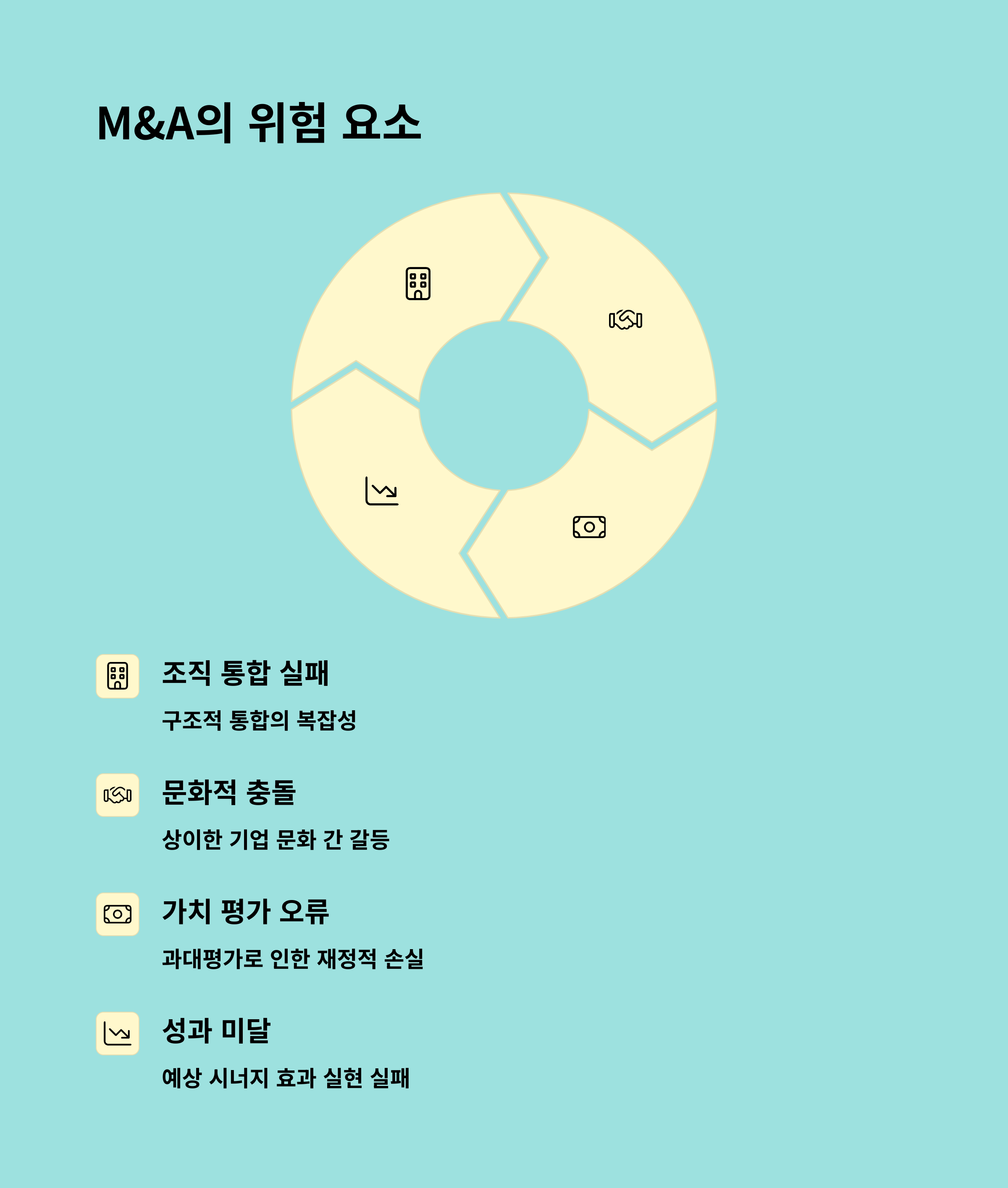 M&A는 기업의 규모 확대와 역량 강화를 위한 핵심 전략 중 하나입니다. 인수를 통해 기술, 인재, 유통망, 브랜드 등을 빠르게 확보할 수 있으며, 내부적으로는 조직 문화의 통합, 경영 구조 재편이 진행됩니다. 그러나 통합 과정에서 충돌이 발생하면 조직 혼란이나 핵심 인력 이탈 등의 부작용이 발생할 수 있으므로, 인수 후 통합(PMI, Post Merger Integration) 전략이 매우 중요하게 작용합니다.