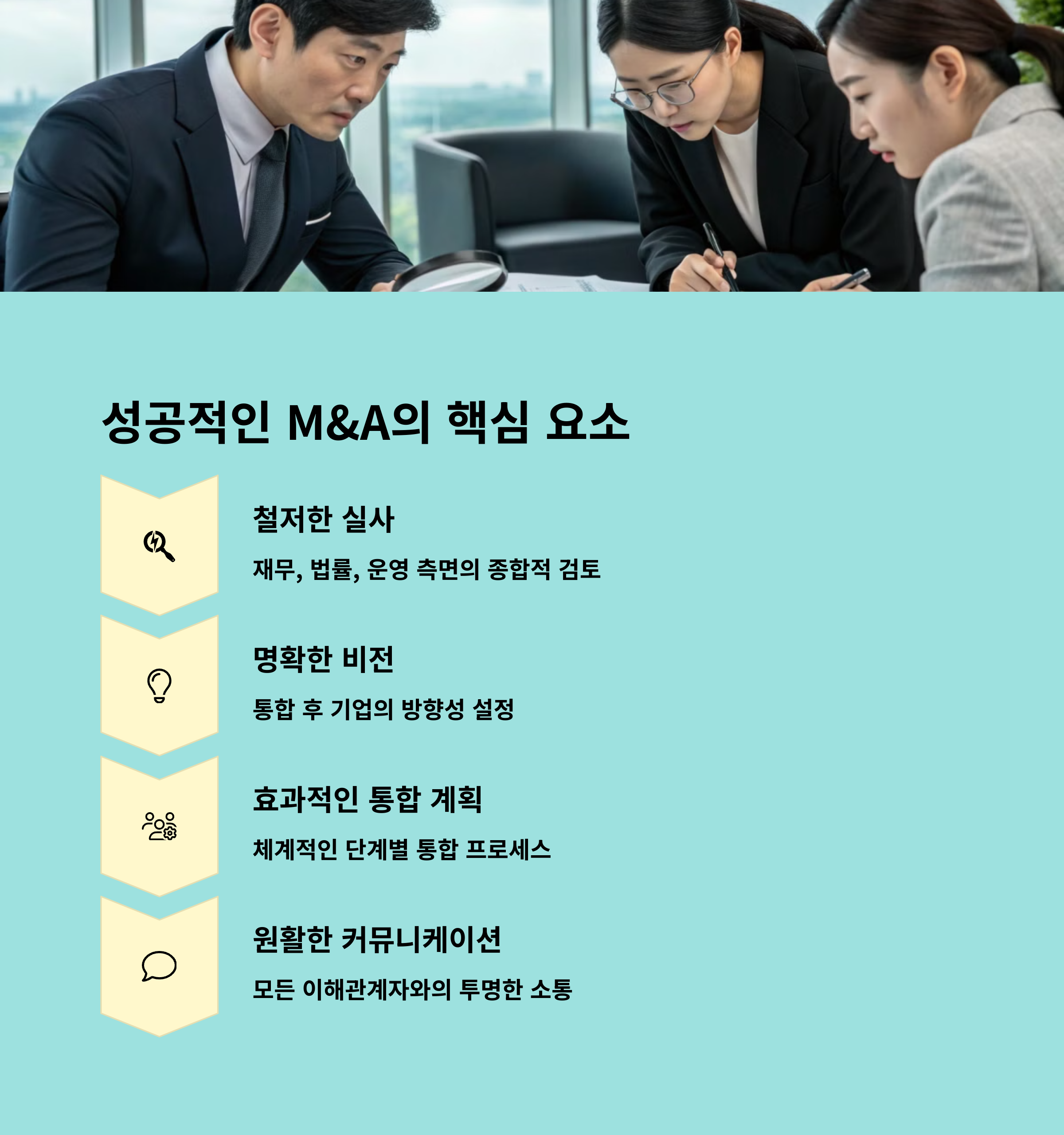 인수합병은 단순한 확장이 아닌 미래 방향에 대한 전략적 결정입니다. 시장 변화에 선제적으로 대응하고, 새로운 가치를 창출하는 성장의 기회로 만들기 위해 M&A의 본질을 꿰뚫는 통찰력이 필요합니다.