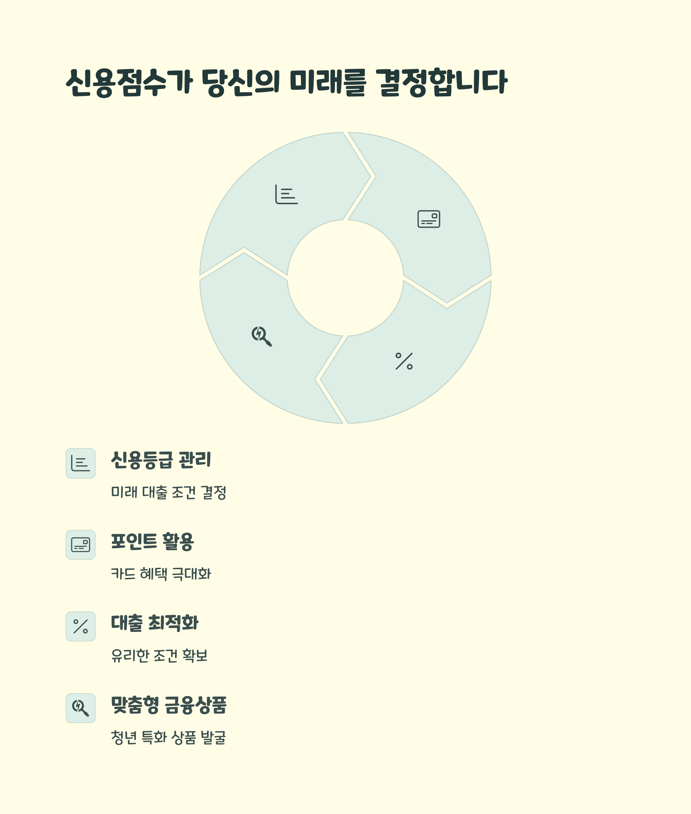 신용 점수는 곧 미래의 대출 금리와 한도를 결정합니다. 카드대금 연체 없이 납부, 통신·렌탈 정보 등록 등 간단한 방법으로 점수를 관리하세요. 20대부터 신용관리 = 투자라는 마인드가 필요합니다.