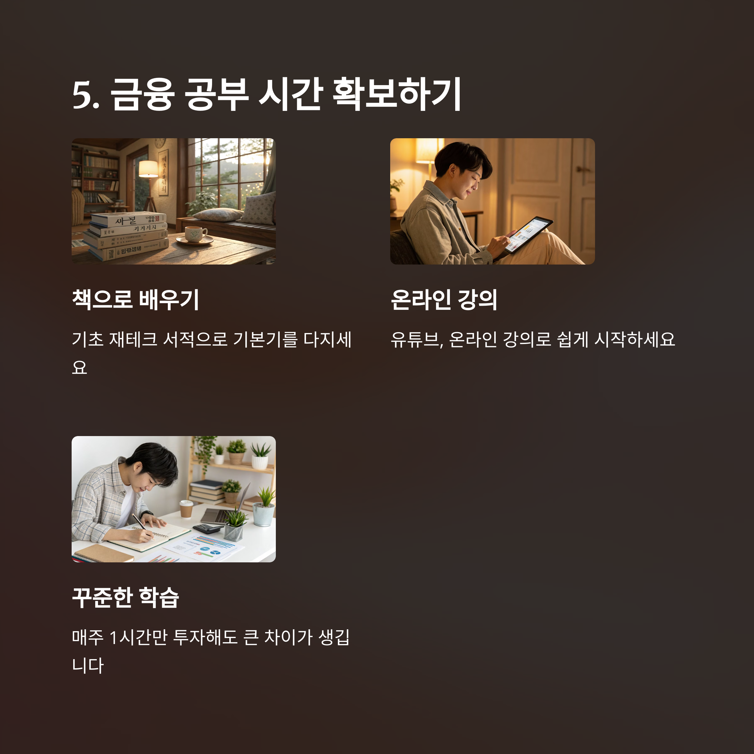 | 지출 기록 | 통장 분리 | 자동 저축 | 소액 투자 | 금융 공부 |